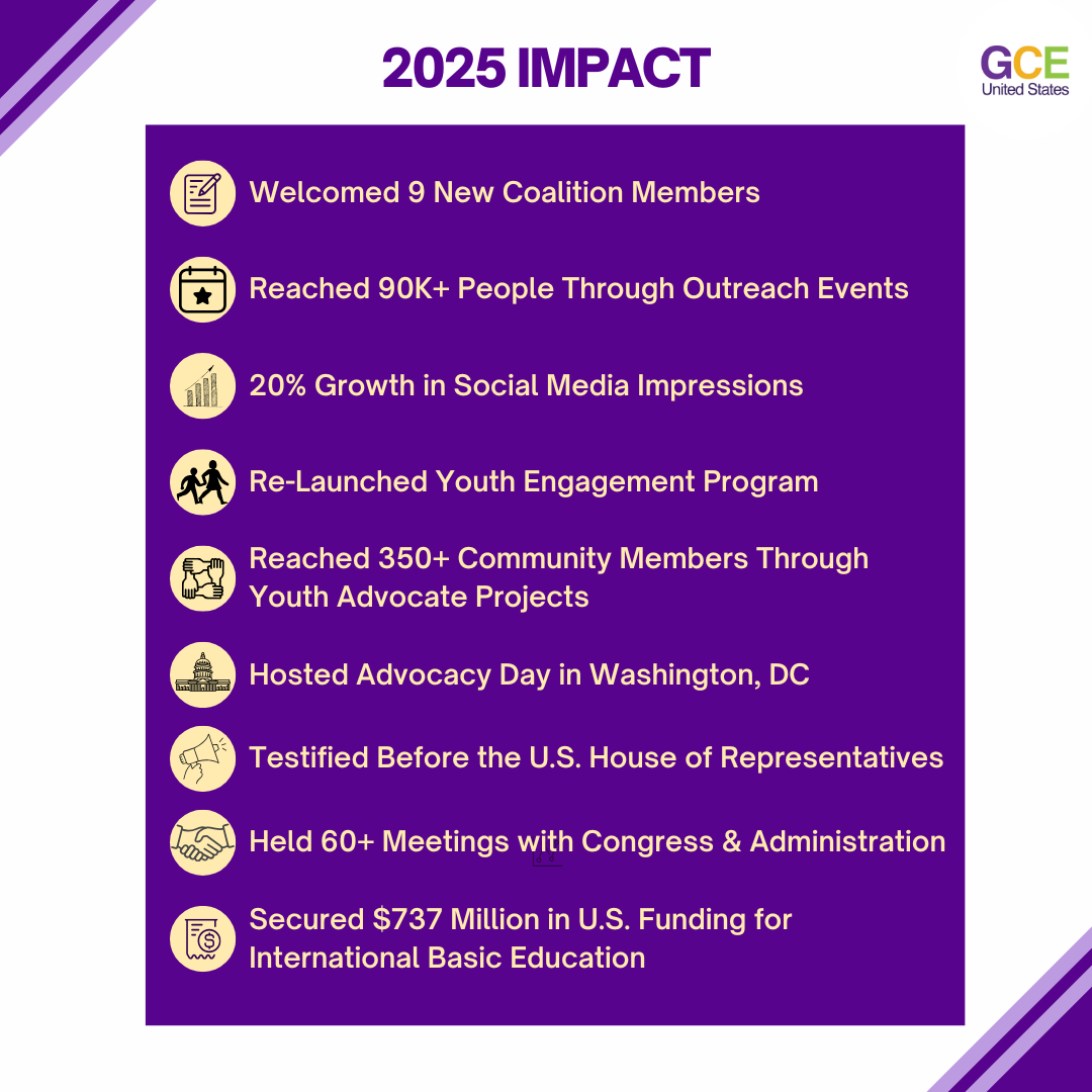 We’re proud to share our 2025 impact highlights. This year, GCE-US expanded our coalition, deepened youth engagement, and strengthened our advocacy reaching 90,000+ people, hosting advocacy efforts in Washington, DC, and securing $737 million in U.S. funding for international basic education.