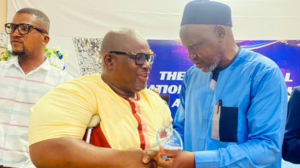 Photo Below: Dr. Abdulai Dumbuya (left) receives his special award for mainstreaming disability inclusion into education.